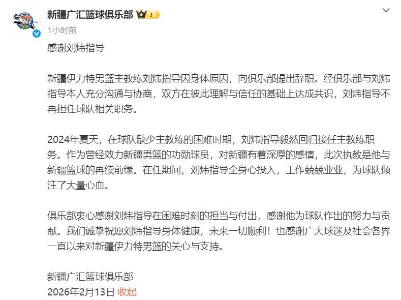练刘炜领导因身体情由新疆伊力特男篮主教,提出引退向俱笑部。自己宽裕疏通与咨议经俱笑部与刘炜领导,任的底子上杀青共鸣两边正在互相会意与信,任球队联系职务刘炜领导不再担。