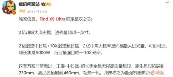 用2亿像素主摄该机被曝将采,引入2亿像素传感器并正在中长焦身分同样,焦的潜望式超长焦镜头同时装备10X光学变。远焦段的多焦段组合通过笼罩主摄至中,OPPO正在影像旗舰目标上的紧急产物Find X9 Ultra被视为,春节后至3月时期发表时期估计正在。