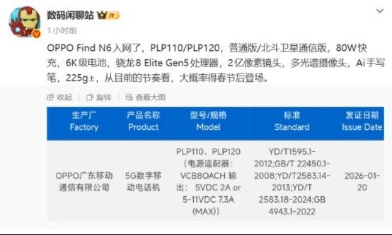 机Find N6已已毕入网OPPO新一代大折叠屏手,与北斗卫星通讯版型号分辨为寻常版。品节律判别从眼前产,正在春节之后亮相该机约略率将。方面装备, Elite Gen5收拾器Find N6希望搭载骁龙8,辨率LTPO UTG主屏采用8.12英寸2K分,62英寸副屏并装备6.。